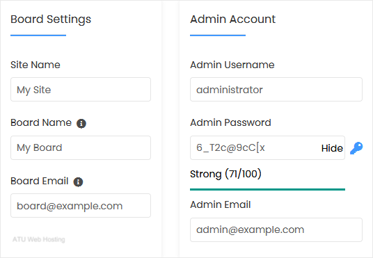 - Admin Username: Your new MyBB username (for security reasons, do not use the administrator or the admin username).